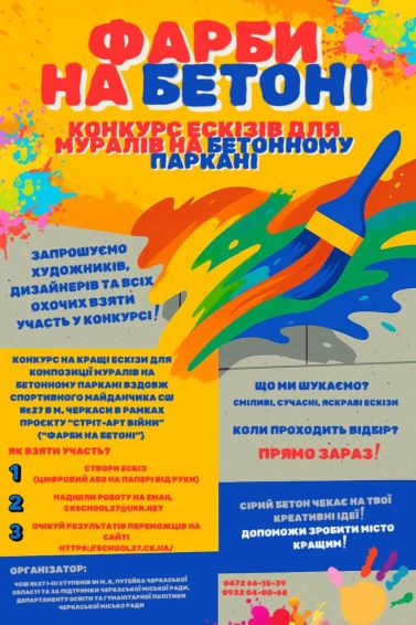 Школа-сусідка №27 оголосила про реалізацію грантового проєкту "Фарби на бетоні" та запрошує художників, дизайнерів та усіх охочих взяти участь у Конкурсі ескізів для муралів на бетонному паркані. Інформація на постері! Креативте та долучайтеся до проєкту!